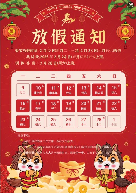 我司2026年春节放假时间为:2026年2月10日(腊月二十三)至2月23日(正月初七),放假共14天。